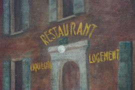 Scorcio urbano con ristorante, olio su tela, firmato in basso a sinistra, cm 45x60