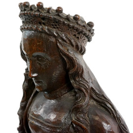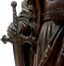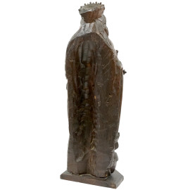 Scultura in legno raffigurante Santa Caterina d'Alessandria con ai piedi Massezio, XIX secolo, altezza cm 89,5