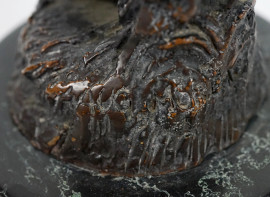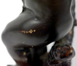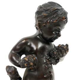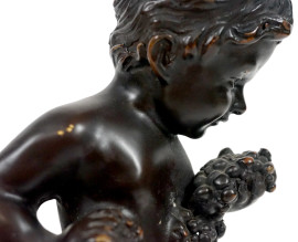 Scultura in metallo brunito raffigurante putto con grappoli d'uva, piedistallo in marmo, XX secolo, h cm 30 (difetti)