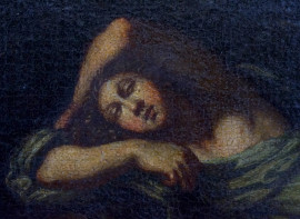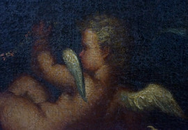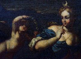 Scuola bolognese del XVII secolo, Diana e Endimione, olio su tela, cm 35,5x 45,5, entro cornice