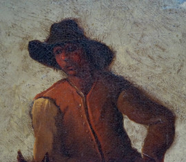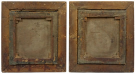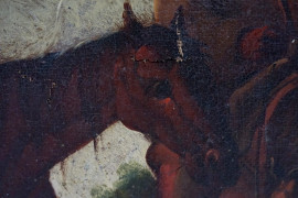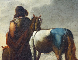 Scuola di Philipp Peter Roos ( 1657-1706), coppia di dipinti raffiguranti Cavaliere in sosta e Viandante con cavalli, olio su tela, cm 44,5x41, entro cornicic, (difetti)