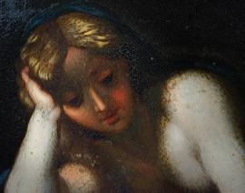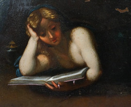 Scuola emiliana del XVI-XVII secolo, Maddalena in lettura entro un paesaggio, olio su rame, cm 31.5 x 40.5
