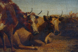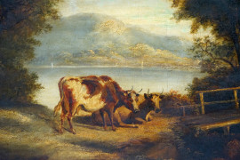 Scuola inglese dell'inizio del XIX secolo, Paesaggio con armento, olio su tela, cm 85,7 x 119,2, entro cornice (difetti)