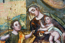 Scuola Veneto-cretese, Madonna con Bambino e San Giovannino, olio su tavola, cm 28x24,8, (cadute di colore)