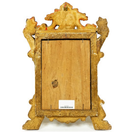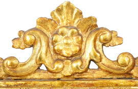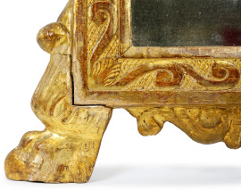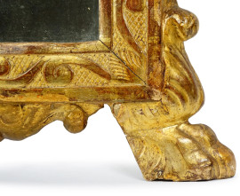 Specchiera in legno intagliato e dorato, Roma, XVIII-XIX secolo, cimasa a volute e fiori, piedi a zampa ferina, cm 47.5x32.5
