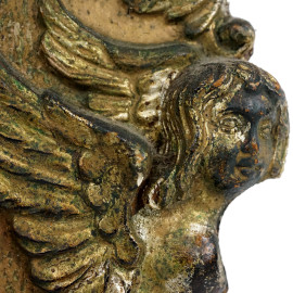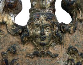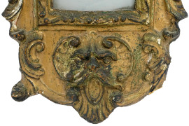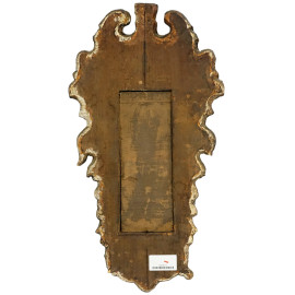 Specchierina in stile Barocco in legno intagliato e stucco dorato decorato con figure di arpie e mascheroni, XX secolo, cm 60x33