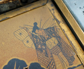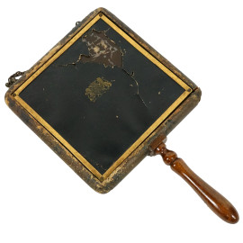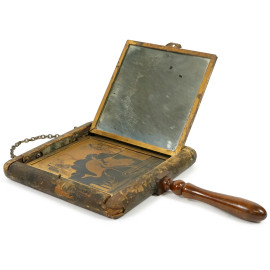 Specchio da barba a tre ante decorato in stile giapponese con montatura in legno, Brevete Sgdg Lb - Datato 1876, Francia, h cm 30,5 (difetti)