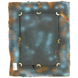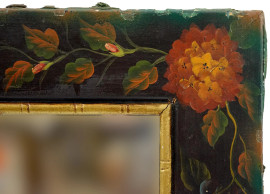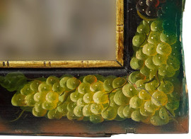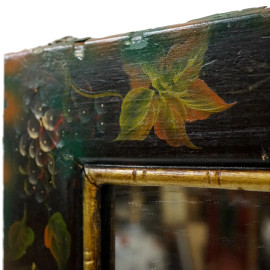 Specchio in legno policromo con decori di frutta e fiori, XX secolo, ingombro cm 58,5x48 (difetti)