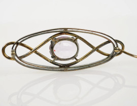 Spilla Liberty in oro basso e argento con pietra centrale, peso lordo gr. 9,5, (difetti)