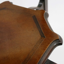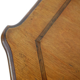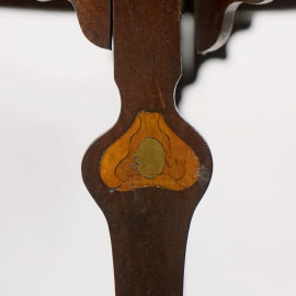 Tavolino stile Liberty, XX secolo, in noce con particolari intarsiati, piano di linea ottagonale poggiante su quattro gambe riunite da traversa, cm h 71x60x60