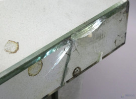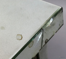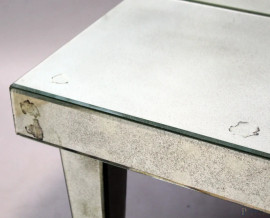 Tavolo basso di linea rettangolare rivestito a specchi, quattro gambe ad obelisco, cm 48x131x69, XX secolo, (difetti, restauri)