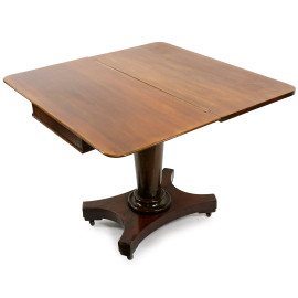 Tavolo da gioco in noce, fine XIX- inizi XX secolo, piano a libretto, gamba a colonna rovesciata poggiante su base quadrilobata, cm h 73x91.5x44.5, (difetti)