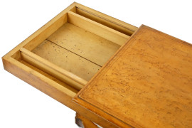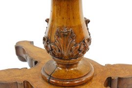 Tavolo da gioco vittoriano in legno chiaro, montante tornito, poggiante su base sagomata, quattro piedi a cipolla, cm 78x88x49, (difetti)