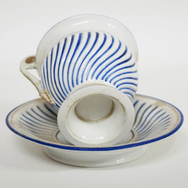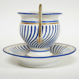Tazza con piattino in ceramica bianca e blu, profili dorati, XIX secolo, altezza max cm 13, (difetti)