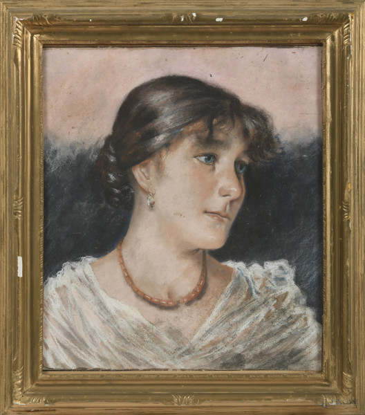 Testa femminile, scultura in gesso su piedistallo in gesso, XX secolo, h cm 47