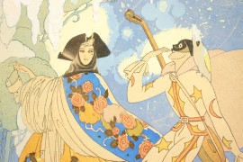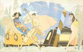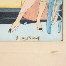 Tre maschere veneziane, stampa a colori, firmata Brunelleschi, cm 28,2x38,3, entro cornice