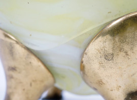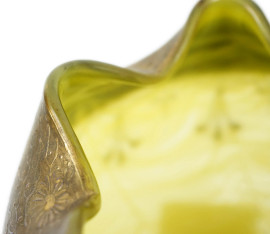 Vaso in vetro verde con corpo ovoidale e bordo smerlato, decori e piedini dorati, XX secolo, cm h 23,5, (difetti)