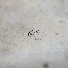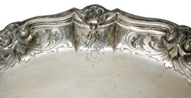 Vassoio in argento, corpo liscio con profilo smerlato e cesellato a volute e conchiglie, manifattura italiana, XX secolo, diam. cm 30,3, peso gr. 484 circa