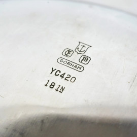 Vassoio in metallo argentato Gorham, di linea ovale poggiante su quattro piedini, cm 45,5x35, (difetti)