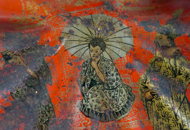 Vassoio in metallo laccato rosso a forma di conchiglia decorato con cineserie, XX secolo, cm 26,5x22,2