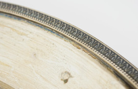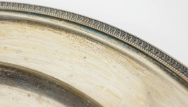 Vassoio tondo in argento 800, XX secolo, con profilo cesellato a foglie lanceolate, diametro cm 40, peso gr. 820 circa