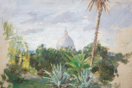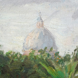 Veduta della cupola di San Pietro, olio su tela applicata su cartoncino, XX secolo, cm 19x28,5, entro cornice