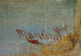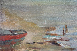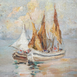 Veduta marina con imbarcazioni, olio su tela applicata su cartone, cm 34,2x42, firmato