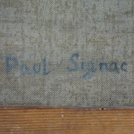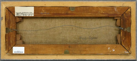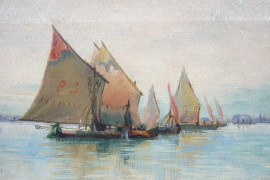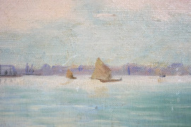 Veduta marina con imbarcazioni, olio su tela, XX secolo, cm 23,3x62,2, entro cornice