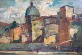 Veduta urbana, olio su tavola, firmato L. Michelacci, cm 25,2x20,8, entro cornice