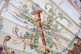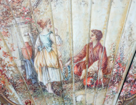 Ventaglio del XIX secolo, dipinto a mano con riserva centrale raffigurante scena galante, entro ventagliera, misure ingombro cm 28x43, (difetti, parti rotte)