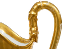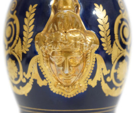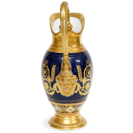 Versatoio in porcellana blu e oro con decori vegetali dorati, corpo decorato sul fronte con la rappresentazione del Suonatore di liuto da Gerard ter Borch (1617-1681), manico a voluta dorato decorato alla base con un mascherone, XIX secolo, cm h 31 (difetti)