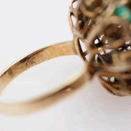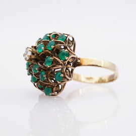 Anello in oro 14 Kt con 19 smeraldi e un diamante centrale, misura 15, peso gr. 6.2, (mancanze)