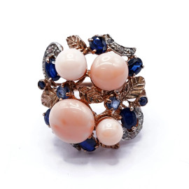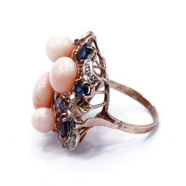 Anello in oro basso 9 kt e argento,brillatini 0,34 ct, zaffiri per 3,30 ct e corallo rosa, misura n.15, peso gr. 12