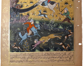 Arte islamica, antica e originale pagina miniata iraniana “Negargarè” raffigurante Scene di caccia, Persia, primi dell’800, colori vegetali e oro zecchino su carta, cm 27x18, reca iscrizioni vergate a pena d’oca e inchiostro nero in lingua araba