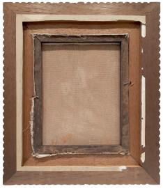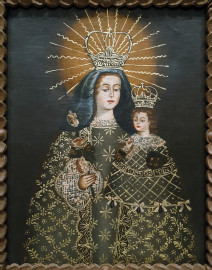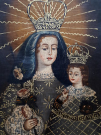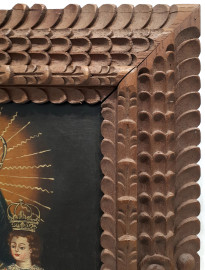 Artista del XX secolo, Le rose di Maria, raffigurazione della Madonna con Bambino ad olio e inserti in oro su tela, cm 30x25, dipinto rifoderato in epoca recente, entro elegante cornice intagliata in legno
