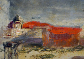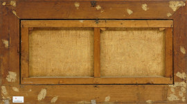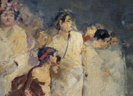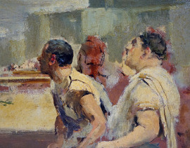 Artista del XIX-XX secolo, Morte di Cesare, olio su tela, cm 34,2x80, entro cornice