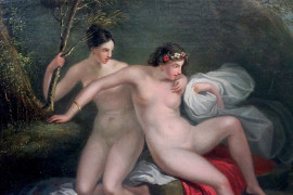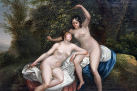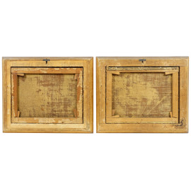 Artista della prima metà del XIX secolo, coppia di dipinti a pendant raffiguranti ninfe al bagno, olio su tela, cm 35.5x45.5, entro cornici