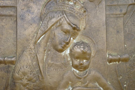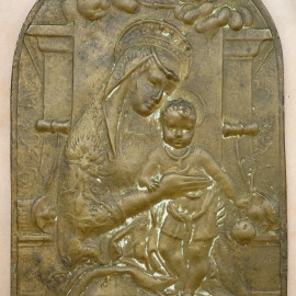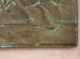 Bassorilievo in bronzo rappresentante la Madonna col Bambino e un piccolo frate francescano orante, "OPUS CAROLI CRIVELLI VENETI 1482", supporto in marmo, XX secolo, cm 38x17