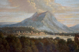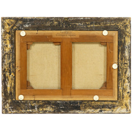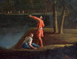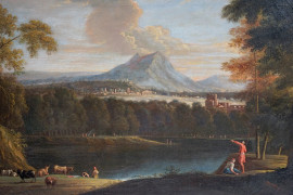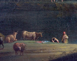Bottega di Paolo Anesi (Roma, 1697 - Roma, 1773), Paesaggio con figure, armenti e rovine sullo sfondo, olio su tela, cm 35x51, entro cornice