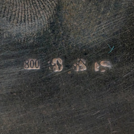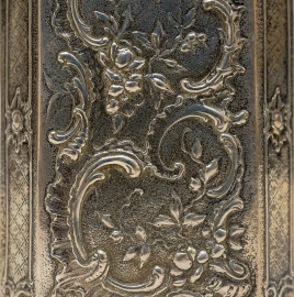 Bottiglia in argento sbalzato e cesellato, punzoni sotto la base, cm h 15x8,3x8,3, peso gr. 370