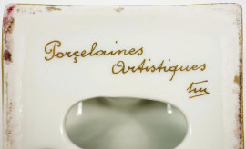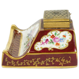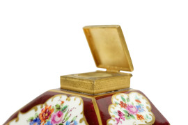 Calamaio in porcellana e bronzo dorato, Francia, XX secolo, cm 5x8,5x8,5