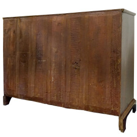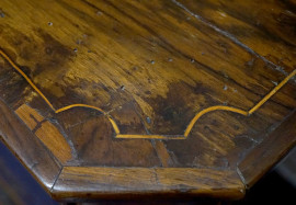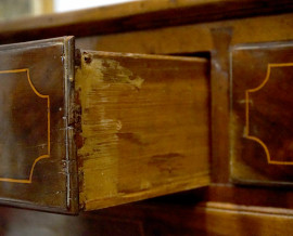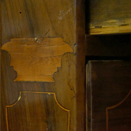 Cassettone in legno noce con riserve filettate, fronte a cinque cassetti, piedi a mensola, prima metà del XIX secolo, cm h 98x128x56,5 (difetti e restauri)