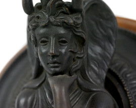 Clipeo di bronzo raffigurante figura che indossa la pelle di un elefante, montato su pannello in legno, diametro cm 18,8