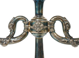Coppia di candelabri in argento cesellato, a due bracci in foggia di testa di cigno, fusto a balaustro poggiante su base circolare, argentiere M. Ghirlanda Roma, XX secolo, altezza cm 37, peso lordo gr. 2210 (appesantiti)