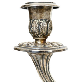 Coppia di candelabri in argento, manifattura italiana, XX secolo, a tre fiamme, fusto scanalato, base circolare baccellata con profili a foglie e perline, cm h 38, peso lordo gr. 1580 circa (appesantiti), difetti