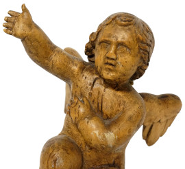 Coppia di sculture in legno rappresentanti due angeli, XX secolo, cm 34 (difetti e restauri)