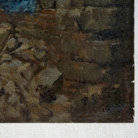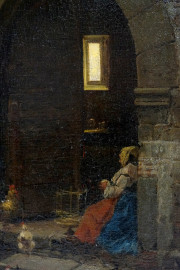 Donna seduta a filare, olio su tela, firmato in basso a destra, cm 45,5x32,5, entro cornice