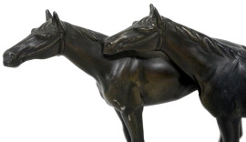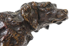 Lotto composto da due sculture rappresentanti una coppia di cavalli in metallo brunito e un cane da caccia in bronzo, altezza max cm 13