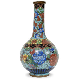 Lotto composto da una coppia di vasetti monofiore ed un incensiere in bronzo a smalti cloisonnè, h max cm 16, (lievi difetti)