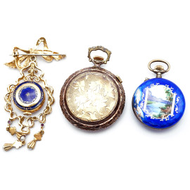 Lotto di due orologi da tasca in metallo dorato e smalti policromi, ed una spilla pendente con orologio in oro giallo 18 kt, lunghezza max cm 7, peso lordo della spilla gr 17